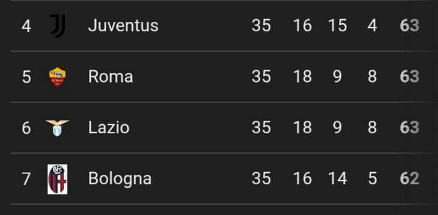 截至目前,经过35轮激烈的比拼,尤文图斯、罗马与拉齐奥同积63分,排名积分榜的前三位,彼此之间仅凭净胜球的微弱差别来区分名次。紧随其后的是的博洛尼亚,以62分紧追不舍,位居第四;而佛罗伦萨则因输球暂时摆脱争四之列,现积59分名列第八。在这样的积分接近情况下,任何一场比赛的结果都可能导致名次的剧烈波动,使得争四的形势变得愈加紧张与复杂。