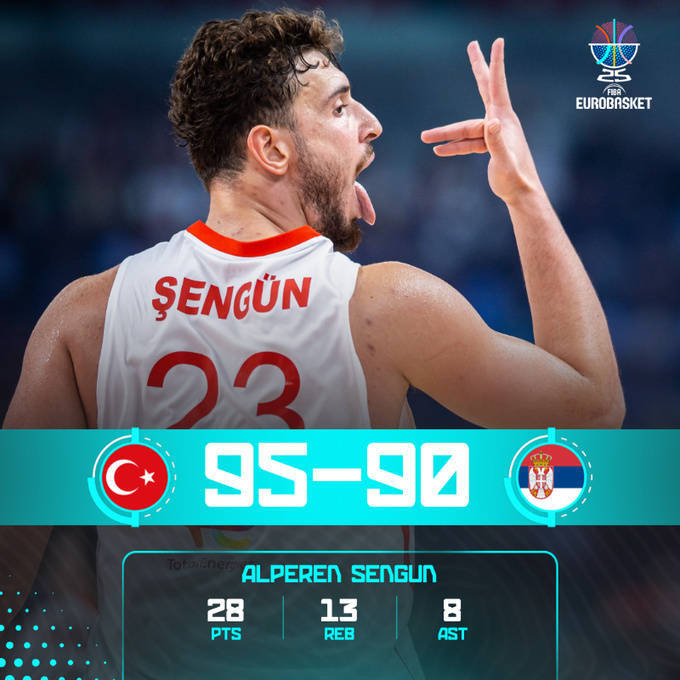 土耳其95-90击败塞尔维亚,5战全胜锁定小组第一。
